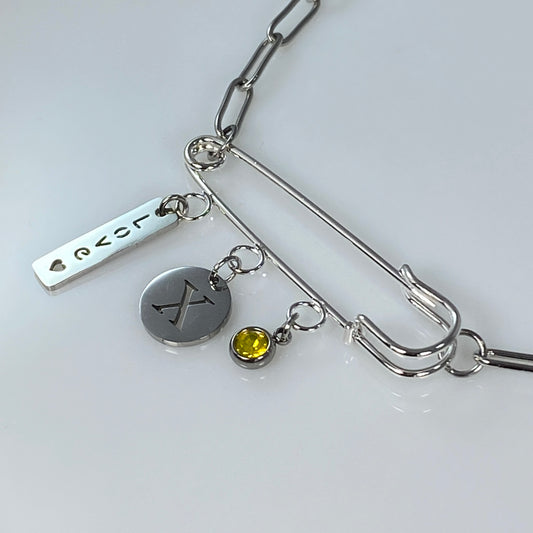 Love, Birthstone & Initial Letter Safety Pin on Paperclip Chain Necklace