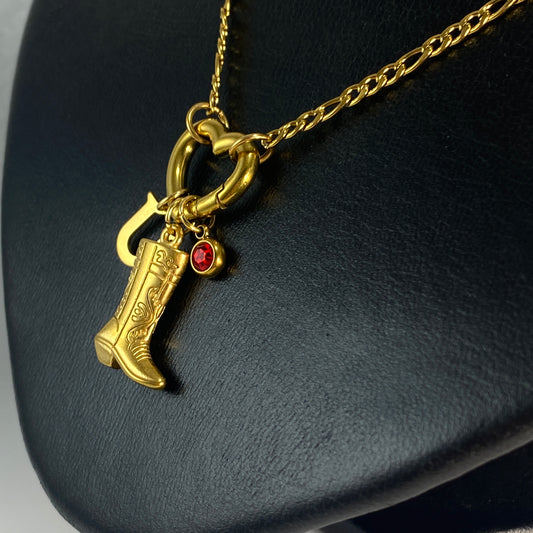 Gold Cowgirl Boot, Letter - Initial & Birthstone on a Heart Carabiner & Figaro Chain Necklace