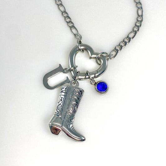 Silver Cowgirl Boot, Letter - Initial & Birthstone on a Heart Carabiner & Figaro Chain Necklace