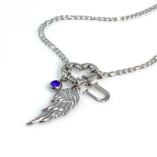Silver Wing, Letter - Initial & Birthstone on a Heart Carabiner & Figaro Chain Necklace