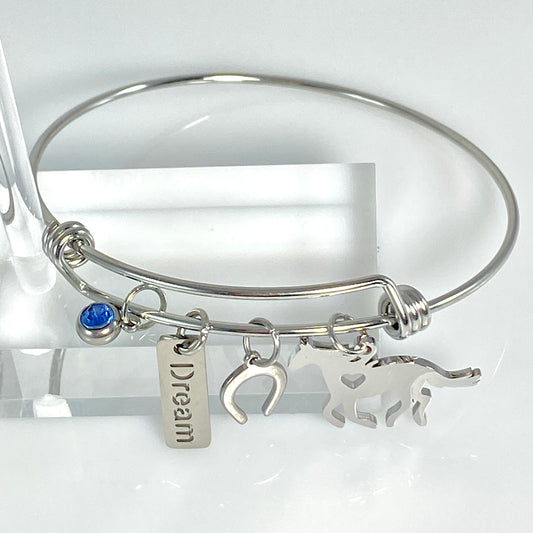 Silver Birthstone & Horse Adjustable Bangle Bracelet