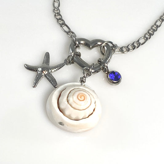 Silver Beach Seastar, Shell & Birthstone Heart Carabiner Figaro Chain Necklace