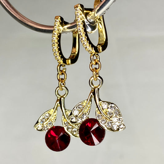 Cerises et feuilles sur crochets de boucles d'oreilles en laiton plaqué or avec zircone cubique