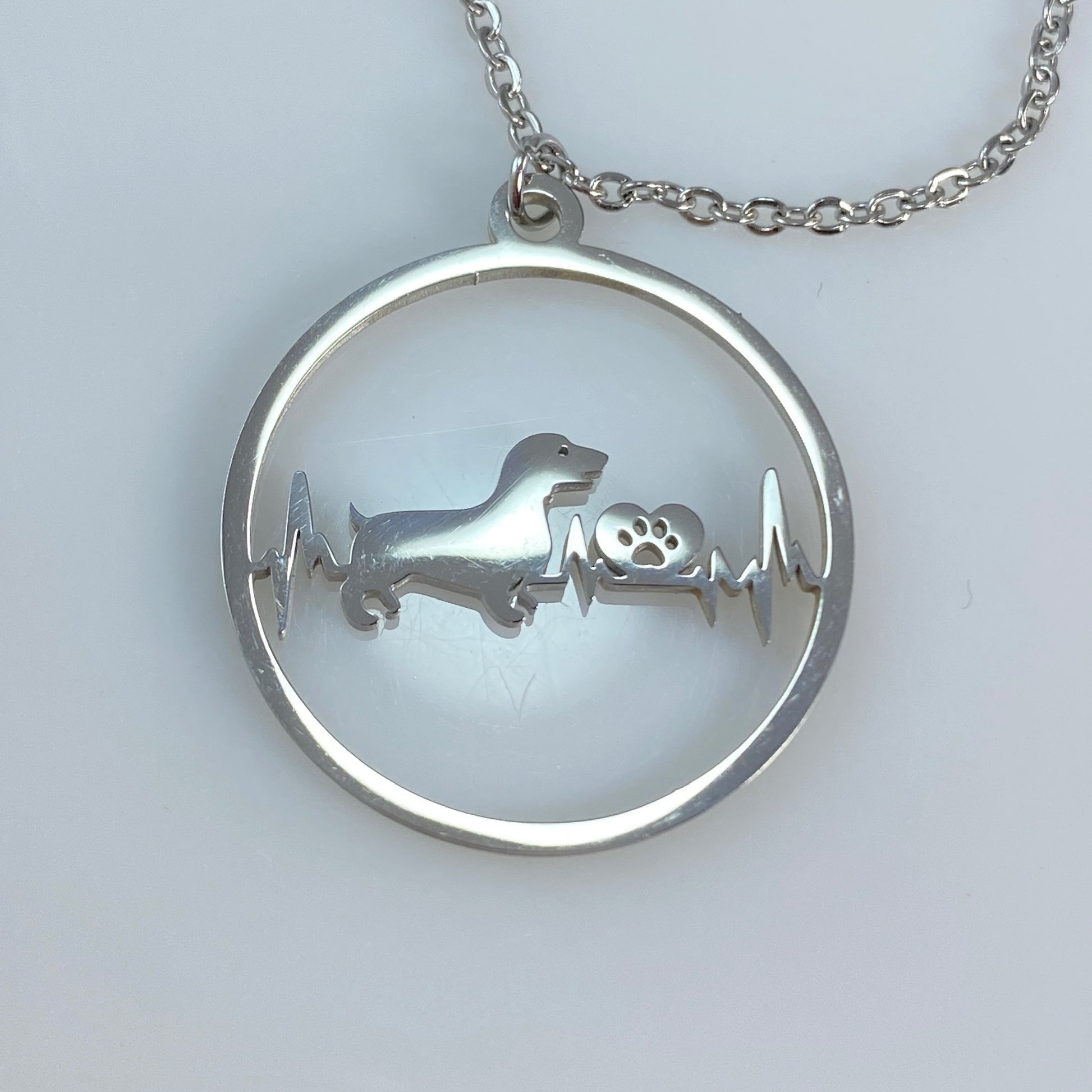 A customized, handmade stainless steel necklace with a sweet Dachshund dog pendant. Add a birthstone to remember your best friend!