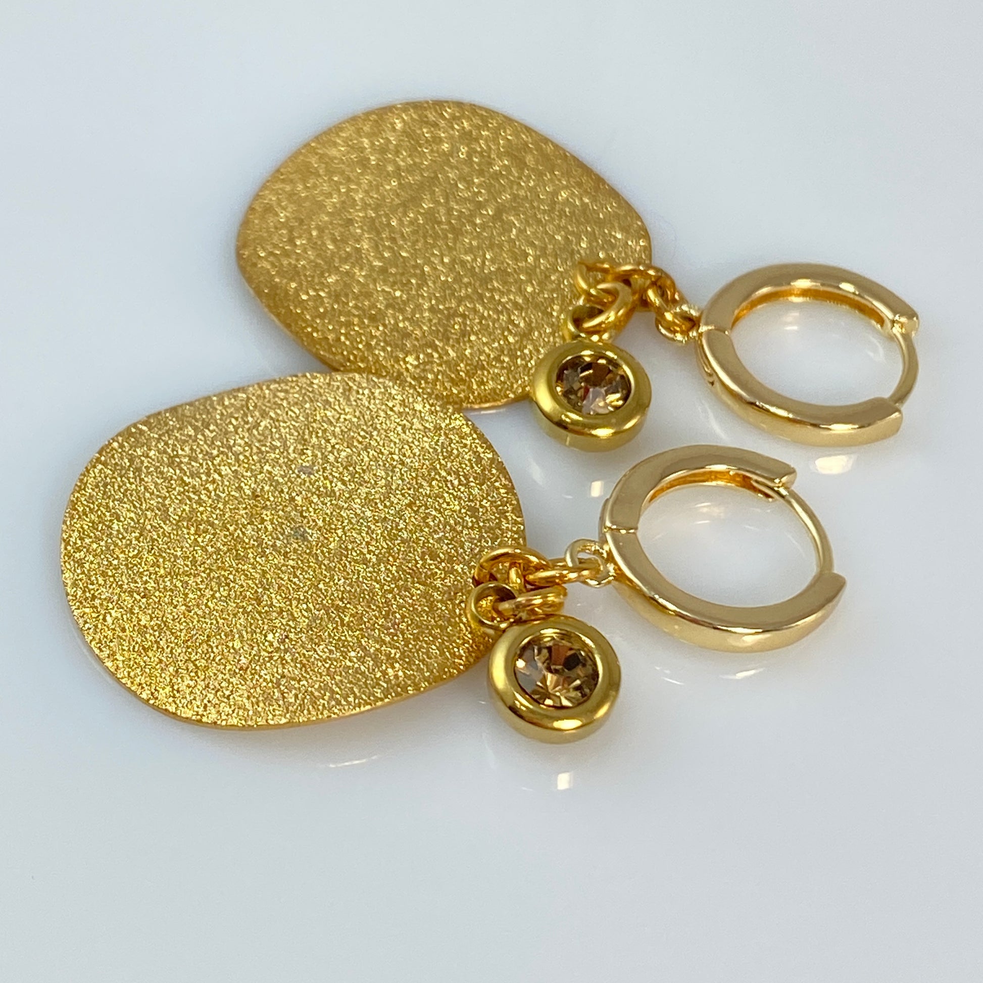 Gold dusted disks and birthstones swing from huggie earring hoops.