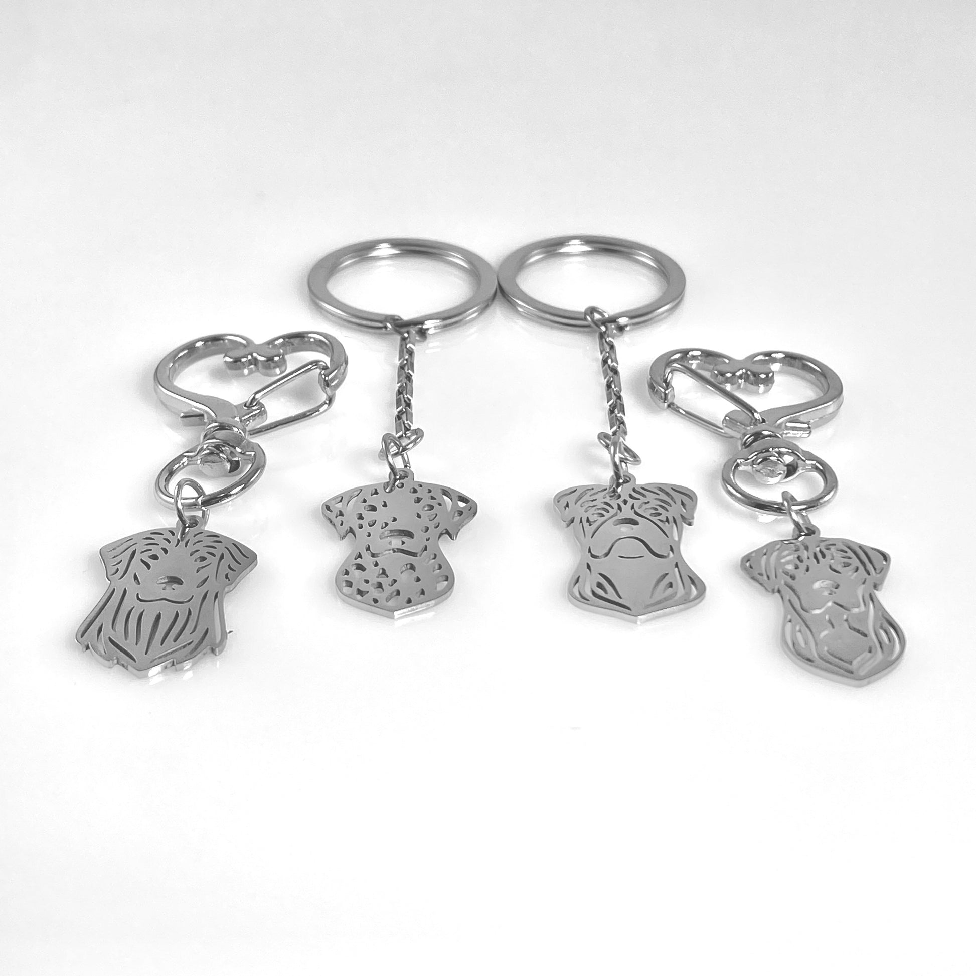 Precision-cut, and highly polished, these dog heads are the perfect addition to your keychain. Choose between a heart or traditional round ring for the keys. Why not add a Birthstone? See the other options of dogs in last photo. Please let us know in the Comments at Checkout if you’d like the chain or not.
