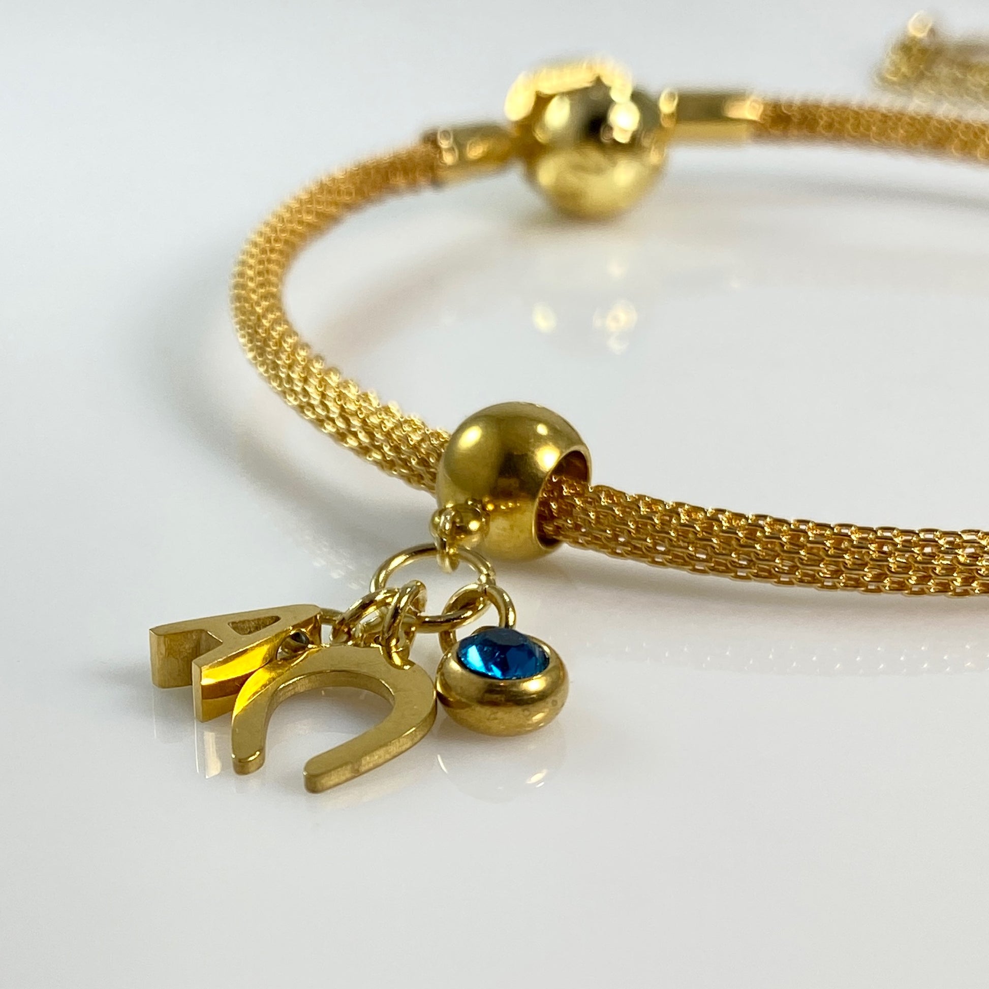 Measurements: Letter initial 12 mm wide X 15 mm X 1 mm depth, Birthstones: 6.5 mm, Horseshoe: 12x10 mm