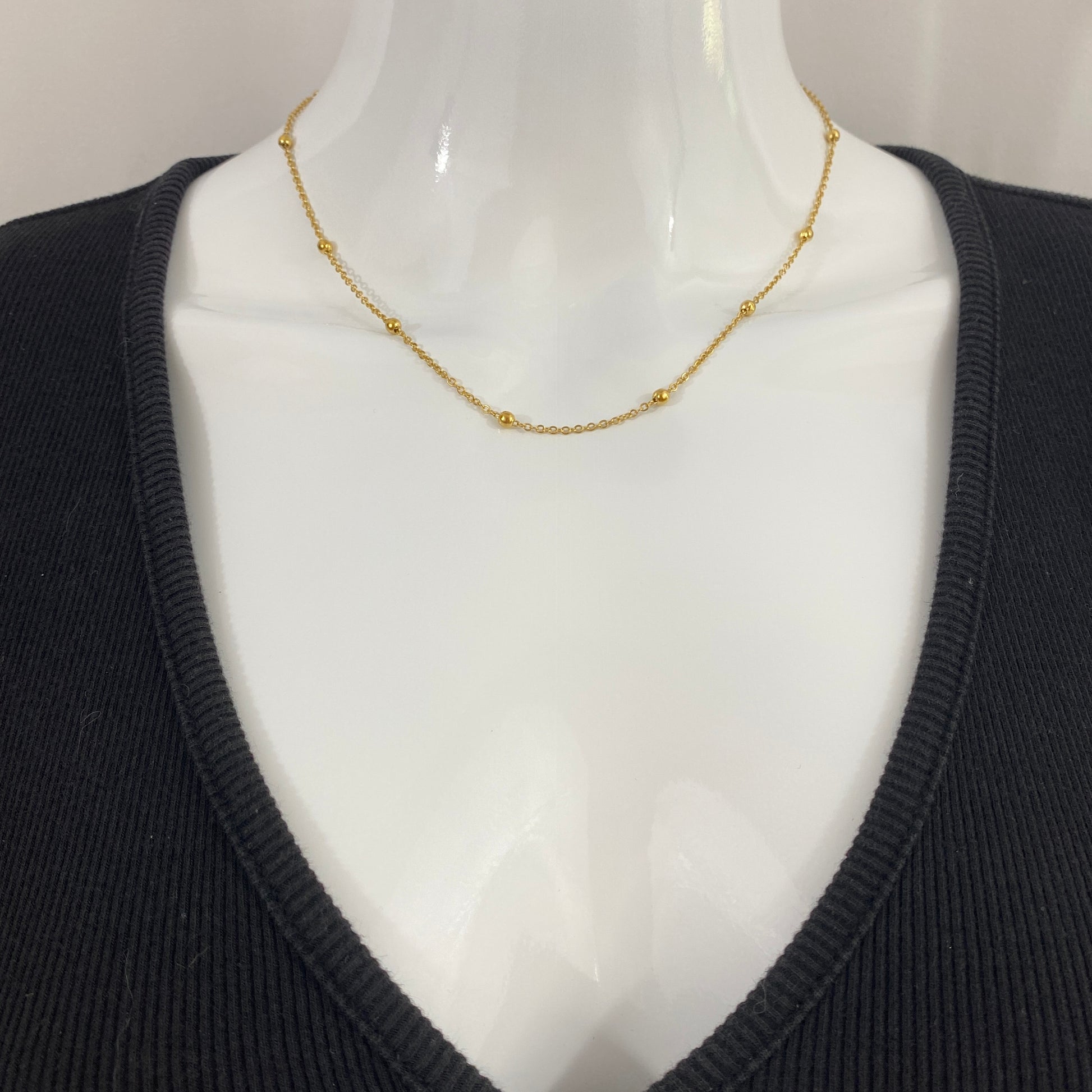 3 mm gold beads set on 2 mm cable chain spaced 2 cm apart. Will you choose the Steel or Gold Plated colour? Or, wear one of each. Matching bracelet is available.
